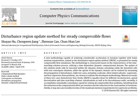 我校李椿萱院士团队的博士生胡姝瑶和蒋崇文副教授、高振勋副教授在物理数学领域排名第一的国际顶级期刊《Computer Physics Communications》上发表题为《Disturbance region update method for steady compressible flows》的学术论文。该文章是我校365英国上市公司在《Computer Physics Communications》上发表的首篇论文,也是我校在《Computer Physics Communications》上发表的首篇流体力学领域的学术论文,是我校在该期刊发表的第五篇论文。