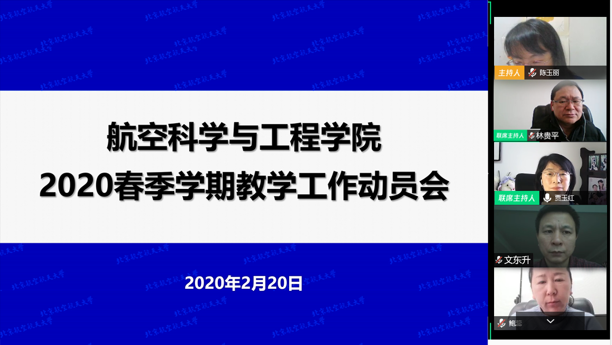 (通讯员 赵雨薇)为了贯彻落实学校疫情防控视频会议精神,确保下周学生线上开课平稳进行,2月20日上午,航空学院召开2020年春季学期延期开学阶段教学专项工作视频会议,院党委书记林贵平、院长文东升、副院长陈玉丽、教学指导委员会主任贾玉红及委员、各系所负责人及教学主任和相关课程教师100余人参加了会议。会议由陈玉丽副院长主持。