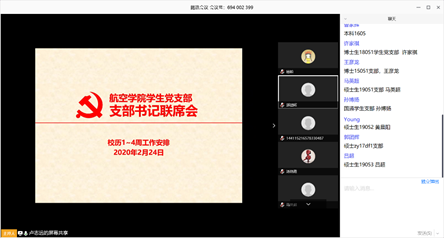 2月24日,航空学院组织召开了线上学生党支部书记联席会,对疫情防控阶段校历第一个月的工作进行了布置安排,并集体学习了习近平总书记在统筹推进新冠肺炎疫情防控和经济社会发展工作部署会议上的讲话,进行了校历第一周“学习日”的集体备课。
