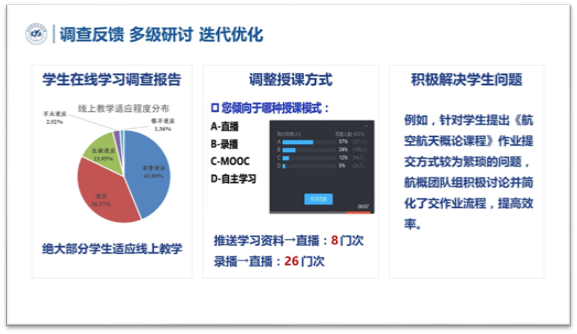 为了合理把握线上教学进度,调整教学手段,航空学院在线上教学开展过程中,从学生调研和多层级研讨两个方面着手,促使教学模式不断优化。