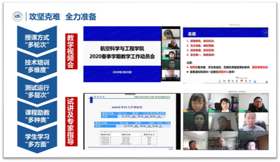 在确定线上授课教学安排后,航空学院进行了细致全面的课前准备工作,组织教学主任逐项核实课程,召开学院教学专项视频会议,经过多轮次审核,最终确定每门课程授课方式;同时,针对困扰教师的网络平台使用问题,开展个人-小组-系所-学院多层级使用培训,并邀请教师分享在线教学经验。正式开课之前,所有课程创建了测试课并完成了试运行,所有教师都完成了试讲。