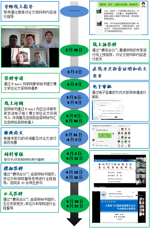 为严格执行国家对高等院校的疫情防控要求及“停课不停学,停课不停教”的战疫方针,我院根据研究生院发布的《关于延期开学期间研究生学位审核安排的通知》和《北京航空航天大学疫情防控期间研究生学位论文线上视频答辩流程及要求》对博士学位进行审核,并组织实施了这两场特殊的博士学位论文答辩。