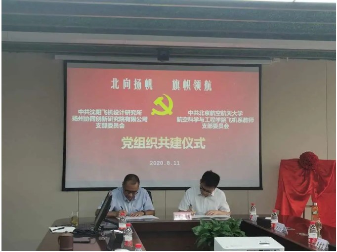 2020年8月11日,飞机系教师党支部前往江苏扬州和沈阳所扬州院党支部举办共建仪式,并达成支部共建协议。党支部书记董雷霆、系主任刘虎,沈阳所扬州院党支部书记杨海俊、总经理陶晓洋、副总经理李毅波等16人参加共建仪式。
