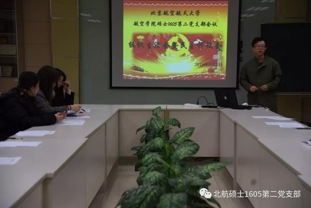 2018年3月3日晚19时,北航航空学院硕士16052党支部会议在新主楼C708举行党支部组织生活会暨民主评议会。会议主要内容是对上学期工作的了解与对本学期工作的展望、民主评议党员、批评与自我批评。本次会议由党支部书记刘明阳同志主持,应到22人,实到20人,2人请假。