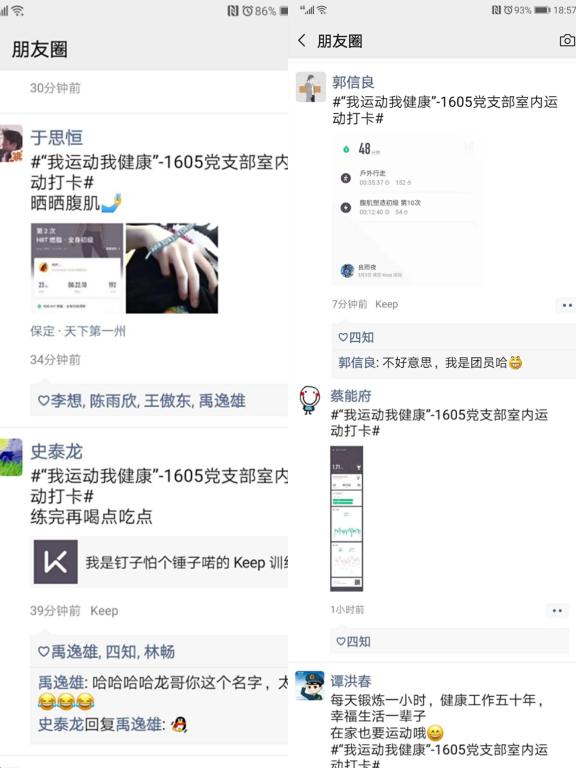 疫情期间,难以出门运动,不少人在网上吐槽自己圆了胖了。除了积极防护,加强运动,强身健体也是我们必不可少的安全保障。为此,1605学生党支部发起了“我运动我健康”居家运动打卡活动,党员同志们以身作则,将自己居家运动的纪录发到朋友圈打卡,带动周围的团员、群众加入到运动健身的热潮中来。党员同志们积极响应,认真运动打卡,年级中的团员受到感召也参与到我们的打卡中来,也让我们倍感欣慰,真切感受到了自己行动的意义。