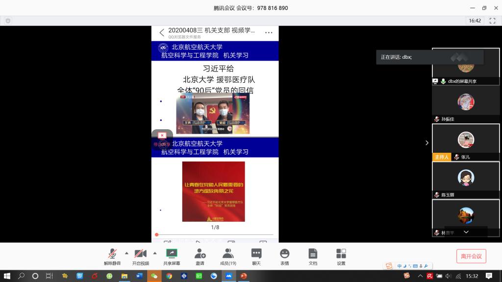 (通讯员 孙振佳)4月8日,航空学院机关教职工在线开展“学习日”活动,机关全体20名教职工集体学习了习近平总书记给北京大学援鄂医疗队全体“90后”党员的重要回信精神、习近平在二十国集团领导人特别峰会上的重要讲话。