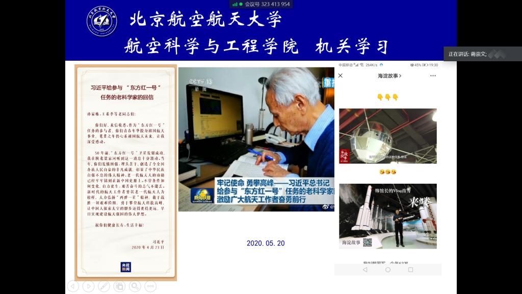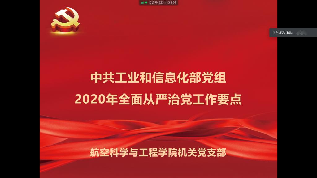 5月20日,航空学院机关教职工在线开展“学习日”活动,机关共19名教职工集体学习了《中共工业和信息化部党组2020年全面从严治党工作要点》精神及习近平总书记给参与“东方红一号”任务的老科学家的回信。