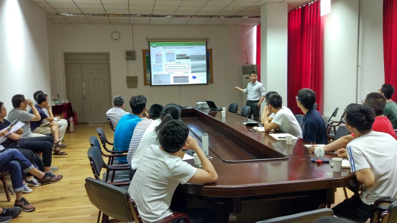 随后,Cheng Wang正式开始了他的报告宣讲。在他的报告中,首先介绍了微流体环境中微米级颗粒的操作在生物医学、食物、环境等方面的应用。报告中主要讨论了两种简单的微粒子操作方法。第一种方法利用了微气泡中压力脉动产生的升学流动,在超声频率下,由声压场驱动,微气泡通过边界层中的雷诺应力建立稳定涡流。第二种方法利用了外部均匀磁场与微通道中的压力驱动相结合来分离非球形微粒子的新技术。实验测量显示,非球形微粒由于不对称旋转角速度和粒子壁流体动力学相互作用的组合效应而发生横向迁移。