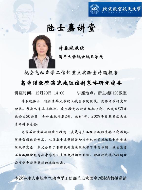 许春晓博士,现任清华大学航天航空学院教授,流体力学研究所所长。长期从事湍流机理、减阻控制和数值模拟研究。已发表SCI收录论文50余篇,合作出版专著2部、教材1部。2009年曾获国家杰出青年科学基金。