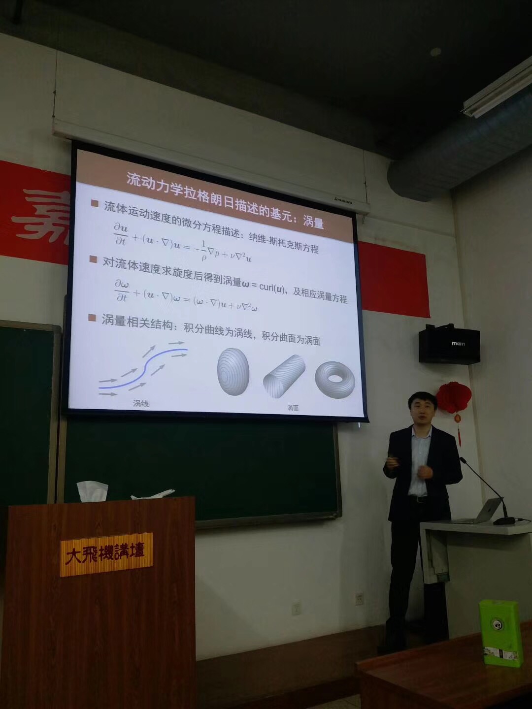 杨越研究员于2011年获加州理工学院博士学位,并获普林斯顿大学燃烧能源中心博士后奖助。2013年起任北京大学工学院力学与工程科学系特聘研究员,国家级青年人才,获求是杰出青年奖。主要从事的研究方向为湍流、燃烧与计算流体力学。本次讲座中,杨越研究员围绕在转捩与湍流运动中如何有效的对拟序结构识别这一问题展开,通过拉格朗日演化观点提出了对拟序结构识别的涡面场方法。阐述了拉格朗日观点下湍流结构的生成机理,并形象的用浴巾卷绕反映“发卡涡”的演化过程。在讲座的最后,杨越研究员还利用标量图像中的小尺度结构壁面倾角信息对超声速边界层转捩中的摩擦阻力曲线进行了估测,并和在场的老师和同学们展开了热烈的交流与讨论。