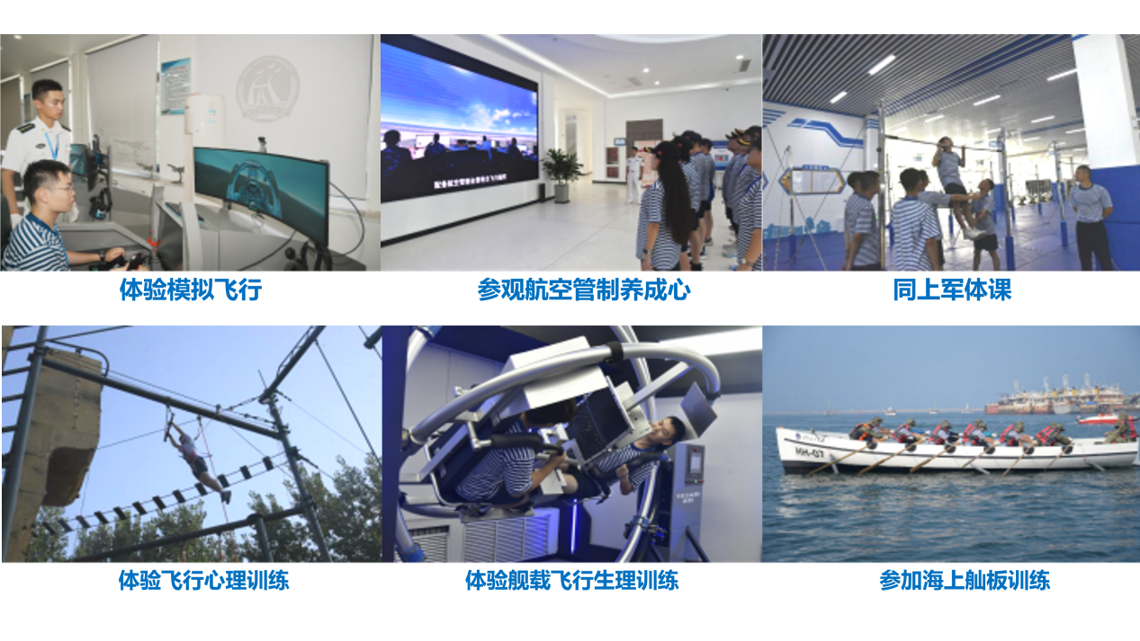 活动中,实践队成员们还亲身体验模拟飞行,参观航空管制养成中心及各类科研教学实验室,在飞行实践中深入理解航空知识,直观感受飞行魅力。通过“战鹰”体能训练、舰载飞行生理心理课程及舢板等海训训练,体验飞行员专项训练科目与选拔,切身体会海军学员向海图强。
