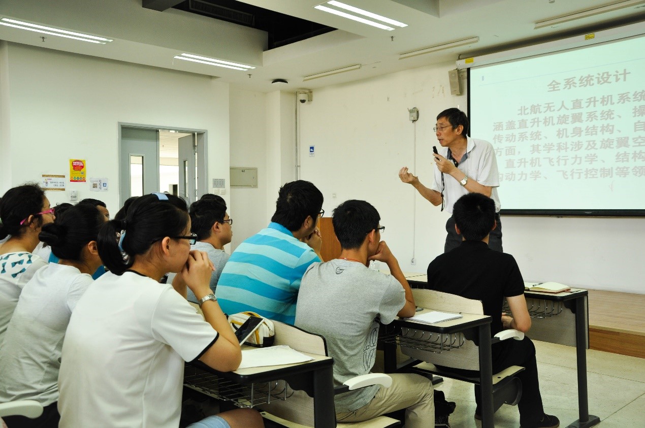 接下来,陈铭教授就直升机专业为同学们做了介绍。他从直升机研究所的前身北航轻型飞机研究设计室讲起,告诉同学们2002年才正式开设的直升机课程后续发展取得的成就。之后陈铭教授针对直升机研究所的教学理念和设计经验,向大家展示了富有特色的现场教学,全国一流的实验设备等等,让同学们大开眼界。