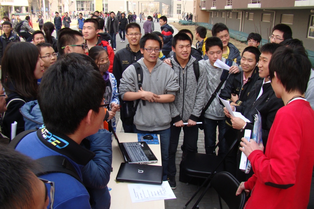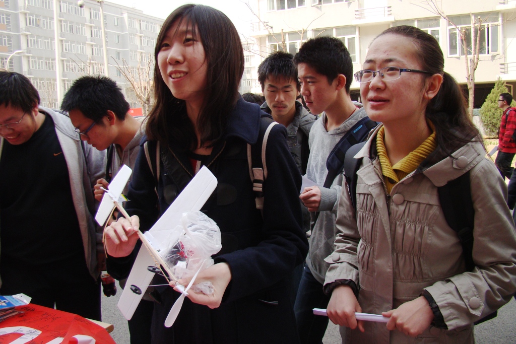 正午刚过,外场宣传活动正式开始,同学们自发地分成了两个队伍,自发地分成了两个队伍,一个队伍拿着传单,喊着宣传语走上了宿舍楼间的校道上,给过往的其他同学散发传单;另一个队伍,在早已布置好的外场场地上,如火如荼地开展着航空知识竞答,为母校签名送祝福,制作飞机,纸飞机飞行大赛,以及航空文化论坛的宣传活动。参与的同学们人人兴趣高昂,现场非常火爆,吸引了广大同学的积极参与。