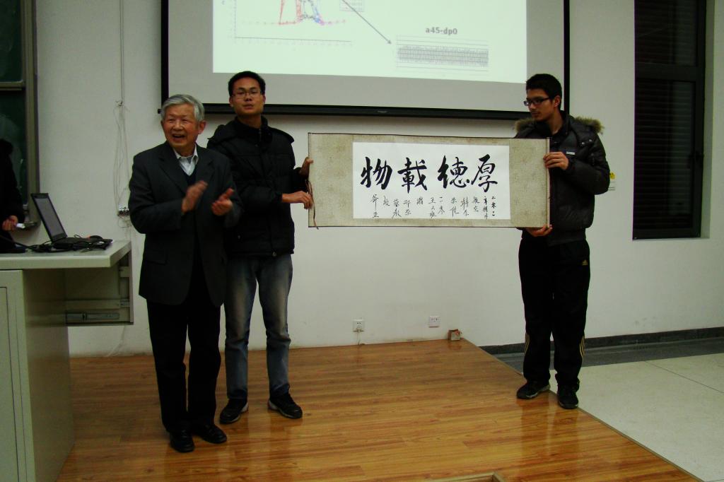 持续了一个半小时的讲座在同学们意犹未尽的热烈掌声中结束了。在这次精彩的讲座中,同学们受益匪浅。正如邓教授所说的那样,树立自己的理想,要做事业的理想,然后经过磨练,最后的“那人却在灯火阑珊处”就是自然而然的事情。无论在修身,还是治学,抑或将来的科研,相信邓教授的谆谆教导都会给同学们带来很大的帮助。讲座结束后,航空学院学生代表向邓教授赠送了亲手书写的书法作品。