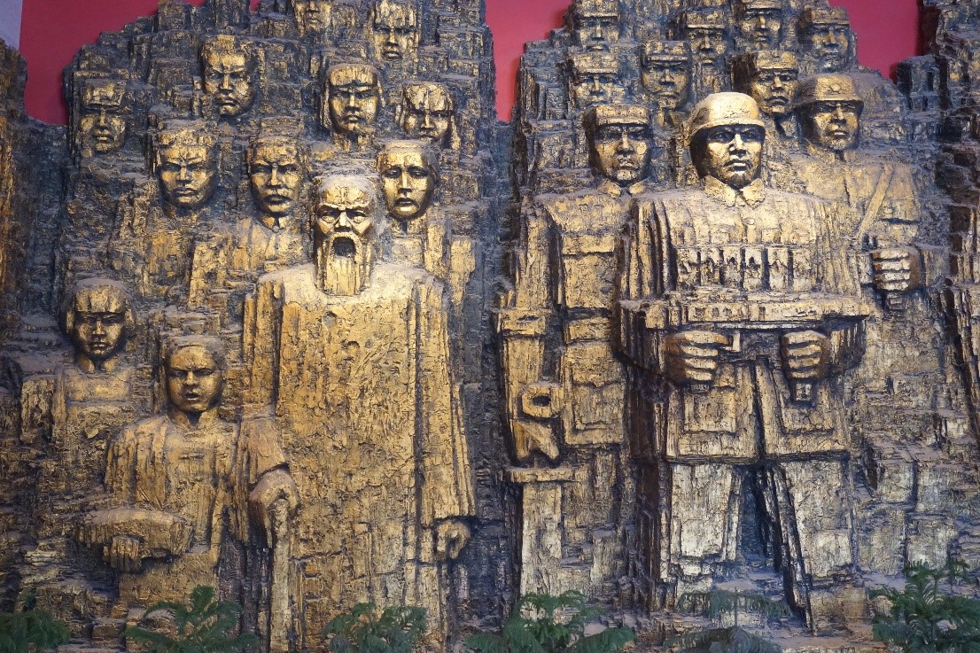 初踏入纪念馆, “独立自由勋章”雕塑便映入眼帘,高大的铜制雕像给人雄壮之感,但战士们凝重的表情却又让我们顿生肃穆,他们是一群追求和平正义、捍卫民族独立自由而不畏强暴、前赴后继、不怕牺牲的勇士!