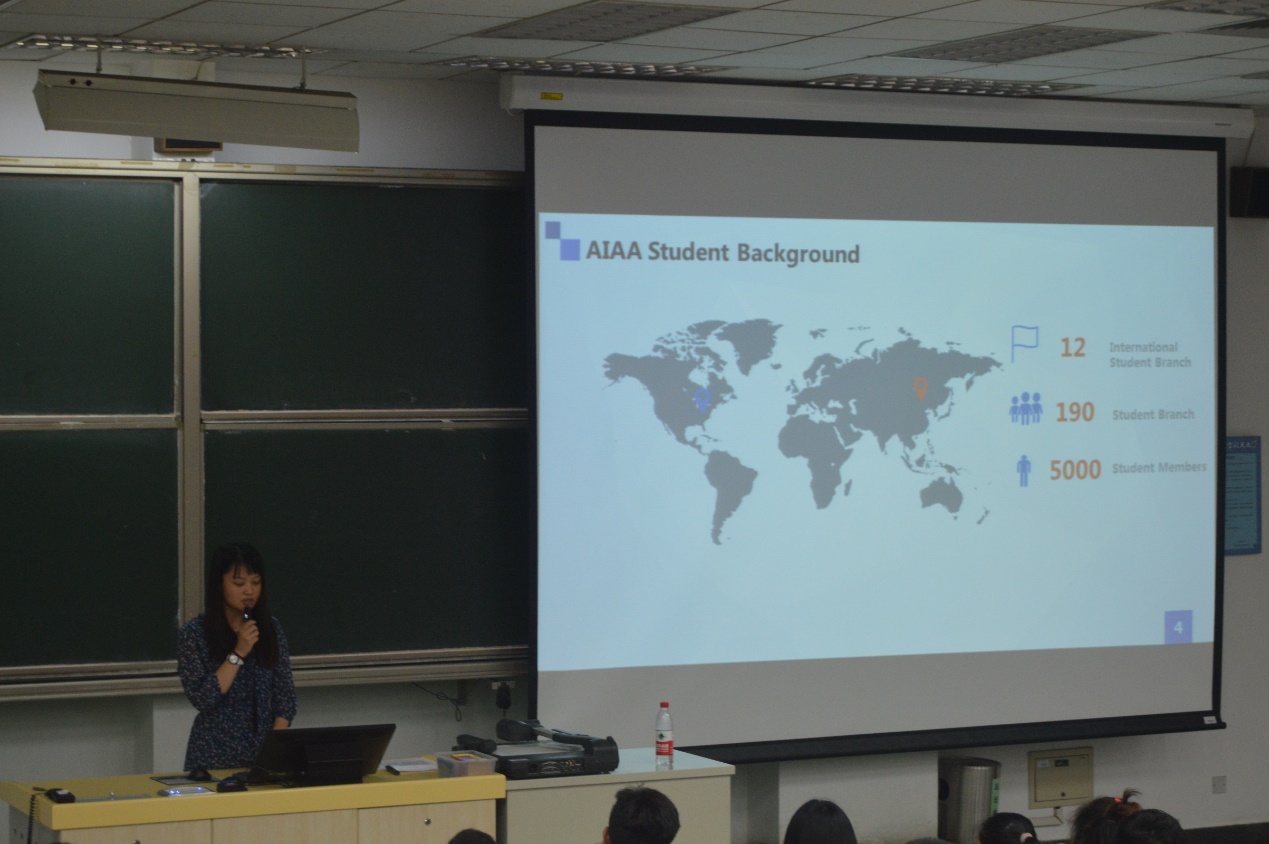 北航AIAA学生分会主席蒲婧也上台进行了宣讲。北航AIAA学生分会在成立的1年时间内,已拥有四十余位注册会员。在这一届新生的加入后,AIAA学生分会在北航的影响将进一步扩大,这将为有志于航空航天事业的研究生搭建更广阔的平台,去实现自己的航空航天梦。