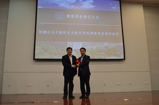 在讲座正式开始前,首先进行了航空学院博雅课堂的聘任仪式。学院为表彰马文胜师兄在自己的工作岗位上取得的优异成绩,同时也衷心期望像马文胜师兄这样的杰出校友们为学院再添成长活力、发展动力,特聘马文胜师兄为航空学院博雅课堂兼职教授。林贵平书记为马文胜师兄颁发了航空学院博雅课堂兼职教授的聘书。