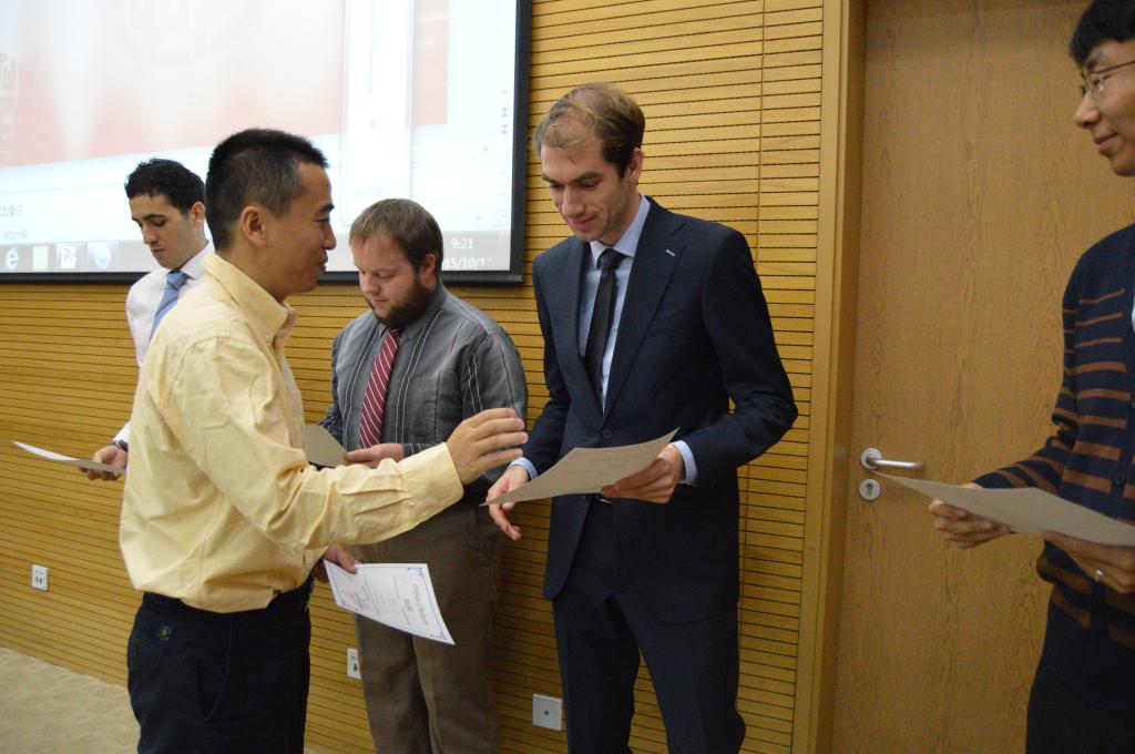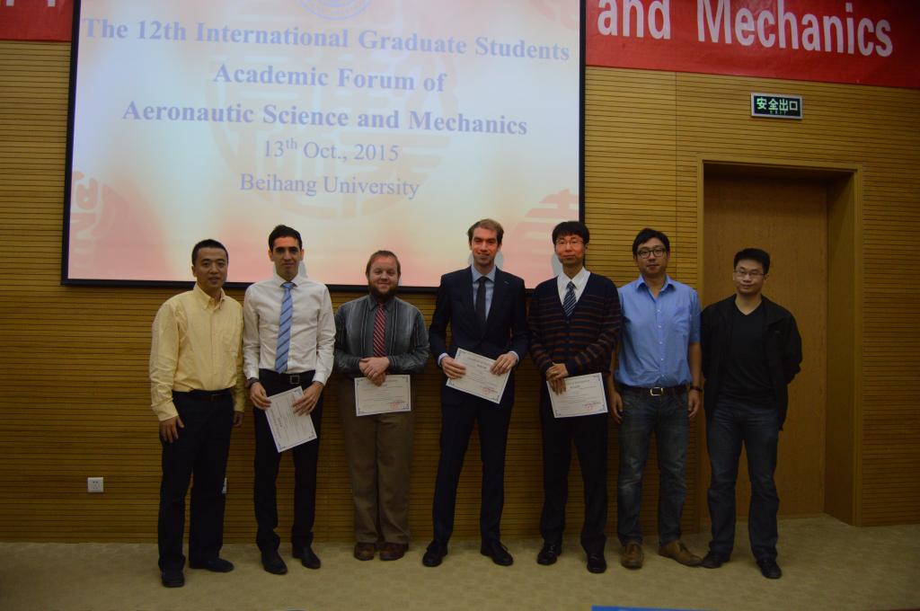 在主持人介绍了出席开幕式的嘉宾之后,航空学院青年教师兼职辅导员胡天翔博士用英文介绍航空学院相关情况及此次国际化论坛的概况。之后航空学院辅导员代表孙玉凯、外籍博士代表Ian Dettwiller依次发言。随后,研究生指导主任蒋崇文老师为外籍博士发放参会证书,并与外籍博士合影留念,标志着此次“歼十”杯学术论坛国际化分论坛正式开始。