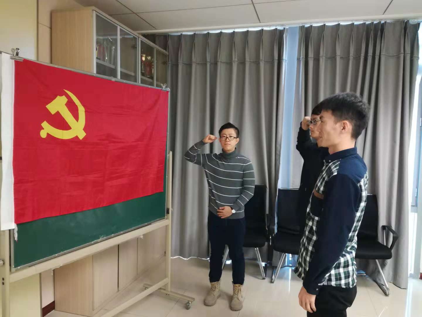 刘明阳同志简单介绍与会党员情况之后会议正式开始,全体起立,奏唱《国际歌》。会议第一项,预备党员周帆、刘雷波同志面对党旗进行庄严宣誓。两位同志铿锵有力的誓言表达了他们志愿加入中国共产党的决心,显示出了他们对于共产主义坚定不移的理想信念。