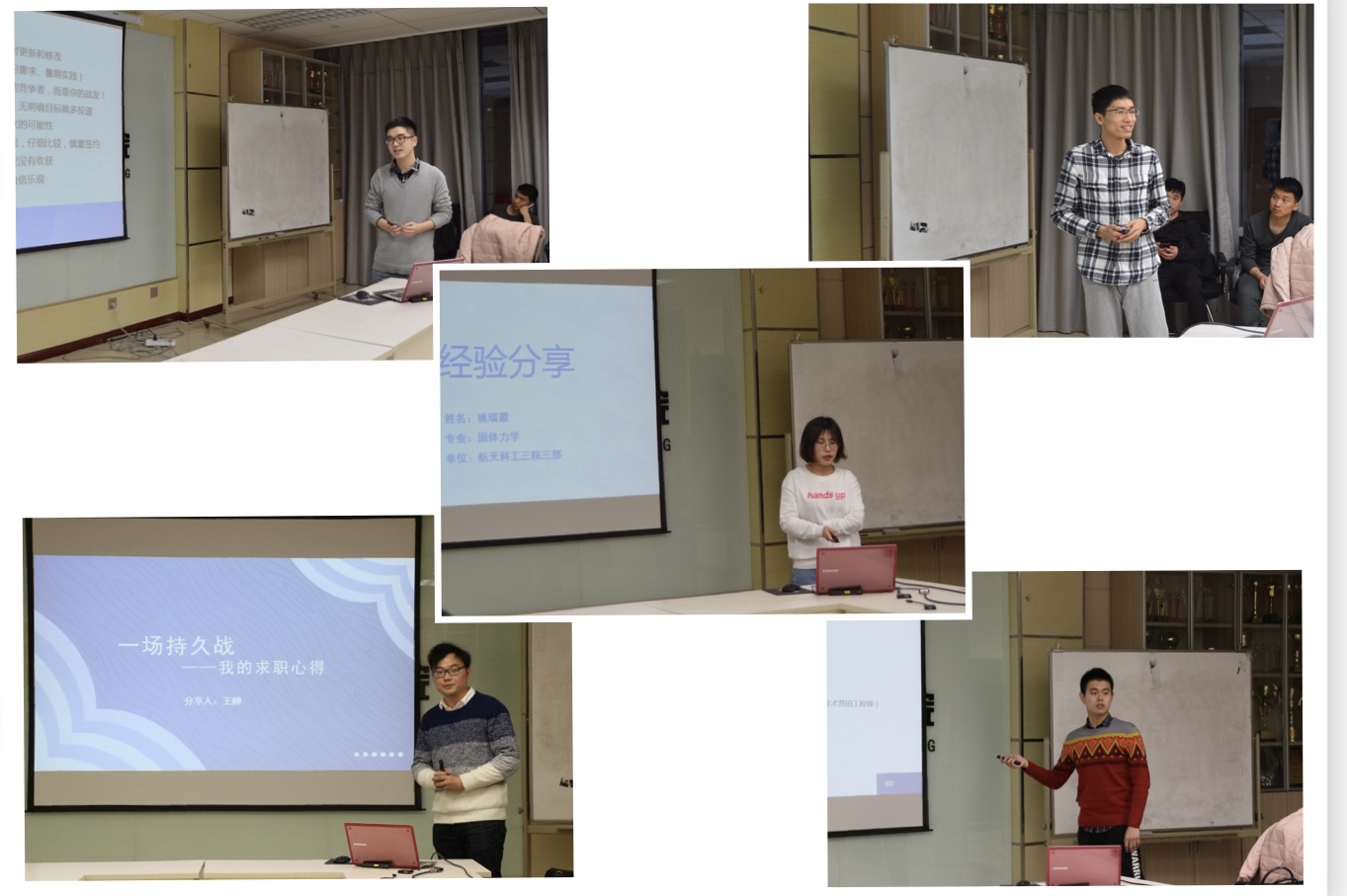 本次分享会邀请了五位来自不同专业的应届毕业生,分别是飞行器设计专业硕士研究生孙亦璋、航空工程专业硕士研究生孔垂欢、固体力学专业硕士研究生姚瑞霞、动力学与控制专业硕士研究生王帅、工程力学专业硕士研究生贺宇。分享会由航空学院研究生会就业部部长吕一凡主持。