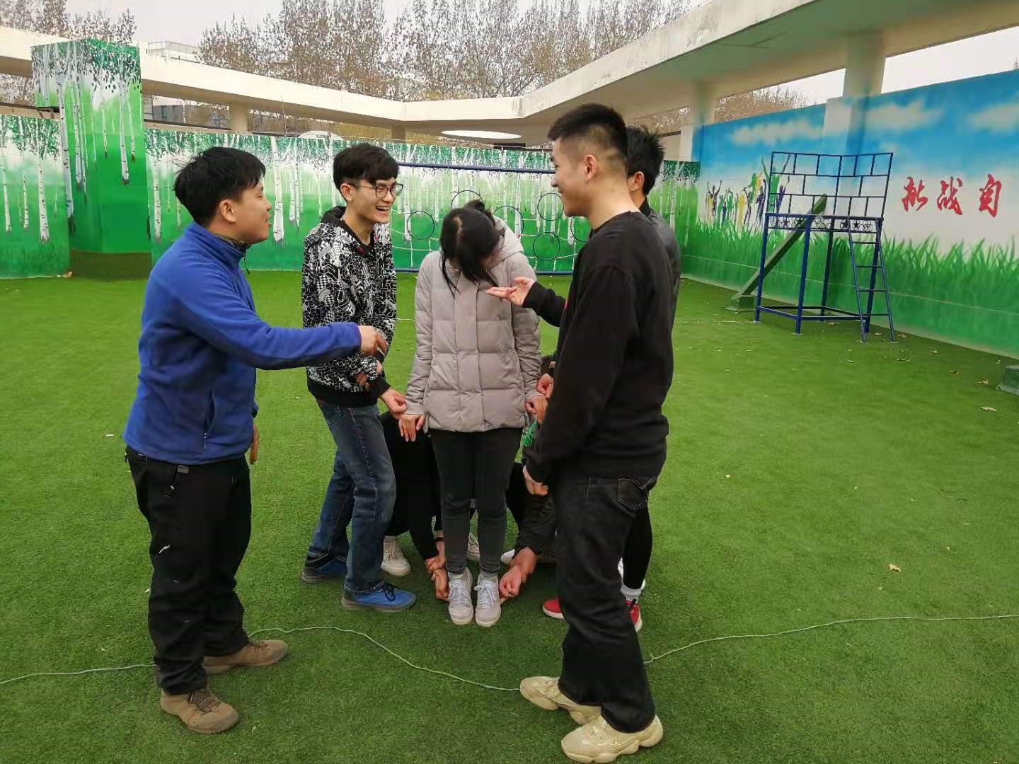 活动在教练的引领下,顺利展开。两支队伍在游戏中你追我赶,全力以赴,力争上游。第一个小挑战中,5名队员需要在教练的要求下协同合作,每人仅用一只手的两根手指,将队长维持脱离地面的状态5秒钟。这考验了我们的思考变通与协同配合能力,在比赛的过程中,我们出奇的协同与默契,成功的完成了比赛任务。