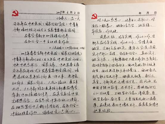 从两会、政府工作报告到习近平进行国事访问、各地考察,支部成员不再只是匆匆浏览手机网页上令人眼花缭乱的消息,而是能够沉下心来,在一笔一划中了解时事,学习先进,反思自己,促进作风转变,为党员精神“补钙”。此外,在日常支部会议上,支部成员也对已摘抄内容进行展示讲解,提高了思想认识,并拓宽了视野。