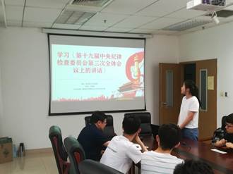 党课之后,由严鹏、朱梦瑶两名同志分别就学习内容向大家进行了汇报。严鹏同志的汇报内容是《关于加强和改进中央和国家机关党的建设的意见》的学习心得汇报,严鹏同志先从《通知》的发表原因出发,讲述了中央和国家机关的重要性,然后以七大意见、二十五条细则为切入点向同志们介绍了《通知》印发的目的、原因和内容,从内容和逻辑上的内在关系出发,全面地分析了加强中央和国家机关党的建设的重要性。