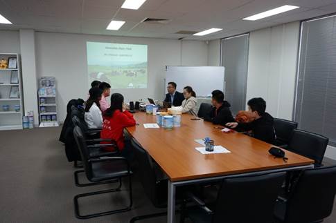在周经理简短的自我介绍之后,队长何东雨详细介绍本次游学活动的主题和内容。周经理肯定游学主题的同时,表示本次主题对调研华人企业,促进中澳经济协同发展和交流起了重要的纽带作用。对于公司,周总理从公司的生产理念讲到生产目标,多方面透露出乳制品生产的高标准高要求。随后周经理介绍维多利亚州的情况,维多利亚州是澳洲大陆面积最小的州,仅占3%,但是农牧业产值占全国的70%,乳制品占全国的65~70%,占全球的18%。ADP公司在维多利亚州有最好的牧场、最优的奶源和最严格的生产要求。最后周经理针对产品走入中国,踏入中国家庭做了简要介绍,他强调“公司按照中国法律要求,在产品表面有中文标识,ADP奶粉产品在中国大受欢迎。ADP公司生产线按照国际先进的危险点监控方法生产,乳制品安全性高,是少数获得获得中国CNC认证的澳洲乳制品公司。”
