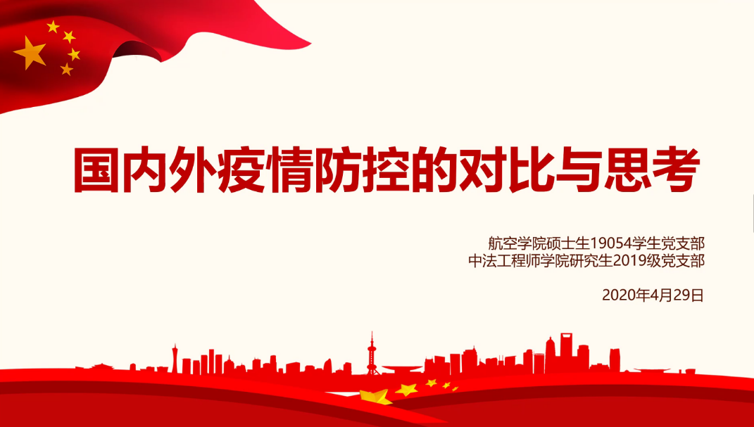 为使支部党员对国内外疫情防控有更加全面的了解,更加深刻的认识到中国特色社会主义的制度优势,更加深刻的感受到人类命运共同体的内涵,北航航空学院硕士生19054学生党支部联合中法工程师学院2019级研究生党支部于4月29日共同开展了主题为“国内外疫情防控的对比与思考”线上交流活动。航空学院硕士生19054学生党支部书记王培生与中法工程师学院2019级研究生党支部书记李林珂共同主持此次交流活动。