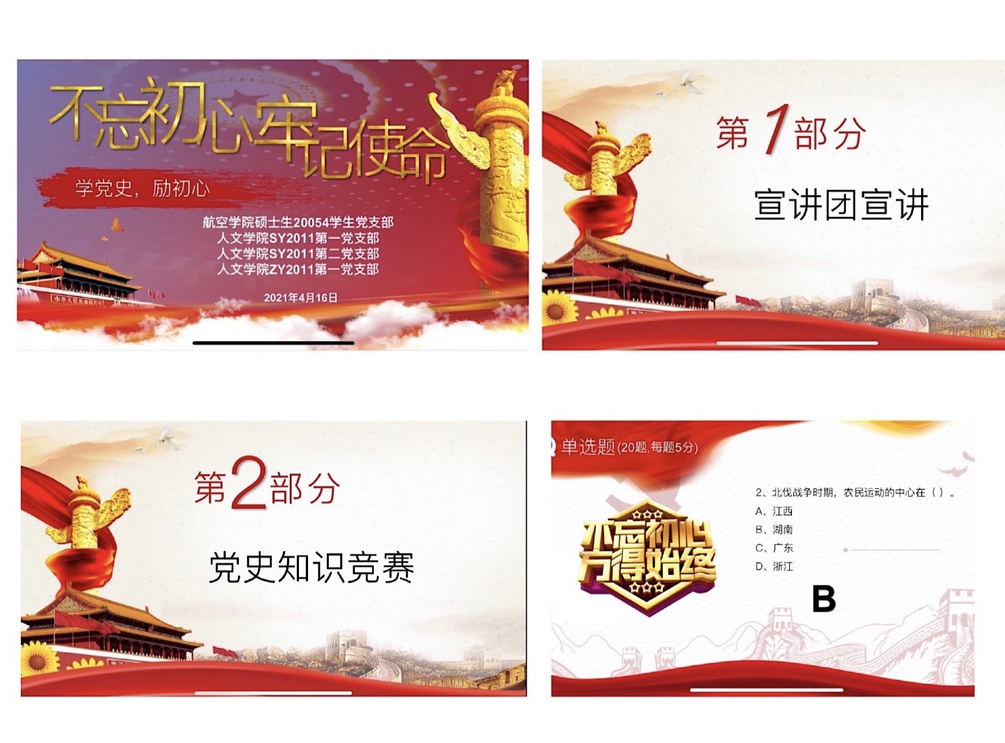 4月16日晚,北航航空学院硕士生20054学生党支部、人文社会科学学院SY2011第一党支部、SY2011第二党支部、ZY2011党支部联合开展了“学党史、励初心”系列主题学习日活动。此次学习日活动主要分为宣讲和知识竞赛两个部分:来自北航研究生宣讲团的武佳奇讲师和北航民法典宣讲团的齐笑讲师分别做主题报告,在集体听取了宣讲报告后,支部成员开展了激烈且具趣味性的党史知识竞赛。活动由航空学院硕士生20054学生党支部书记强鑫主持。