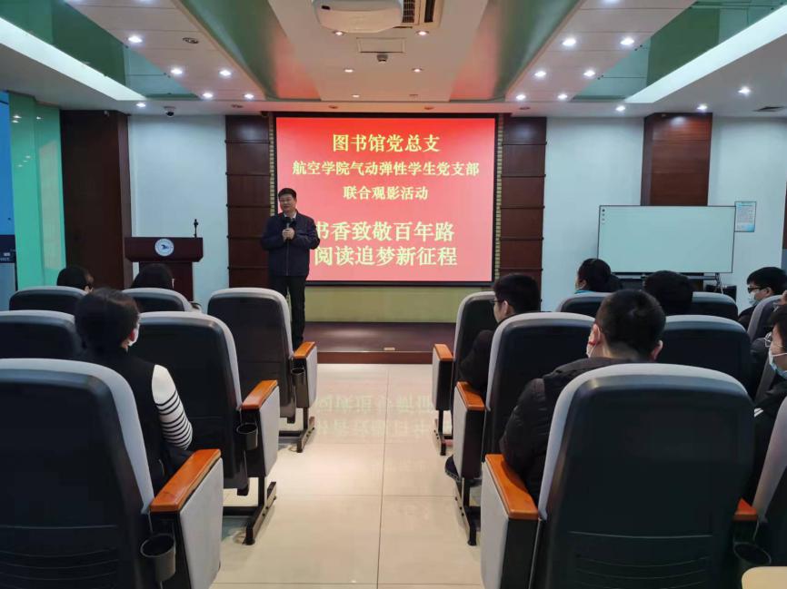 在观影前,北航图书馆党总支书记、馆长杨超教授发表了讲话。杨超教授首先高度评价了近期图书馆党总支第二党支部与气动弹性学生党支部联合开展的一系列共建活动。前期活动中,两支部党员举办座谈会展开谈论,设计调查问卷,调查并分析了北航学生阅读习惯、对图书馆的了解程度等,得出了一系列有助于提高图书馆服务质量的结论;针对调查中暴露出的问题,开展了主题辩论活动,将实践与思辨结合,激发了同志们的阅读兴趣;此外两支部共同发起的21天读书打卡活动,也受到广泛关注,目前已有众多师生参与,累计打卡次数已有一千一百余次。