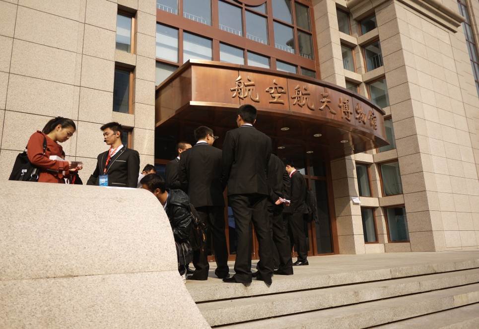 讲解志愿者准备入场 全世界仅存的两架“黑寡妇”之一 2012年10月19日,为迎接北航60周年校庆,北京航空航天大学航空航天博物馆首度揭开了其神秘的面纱。