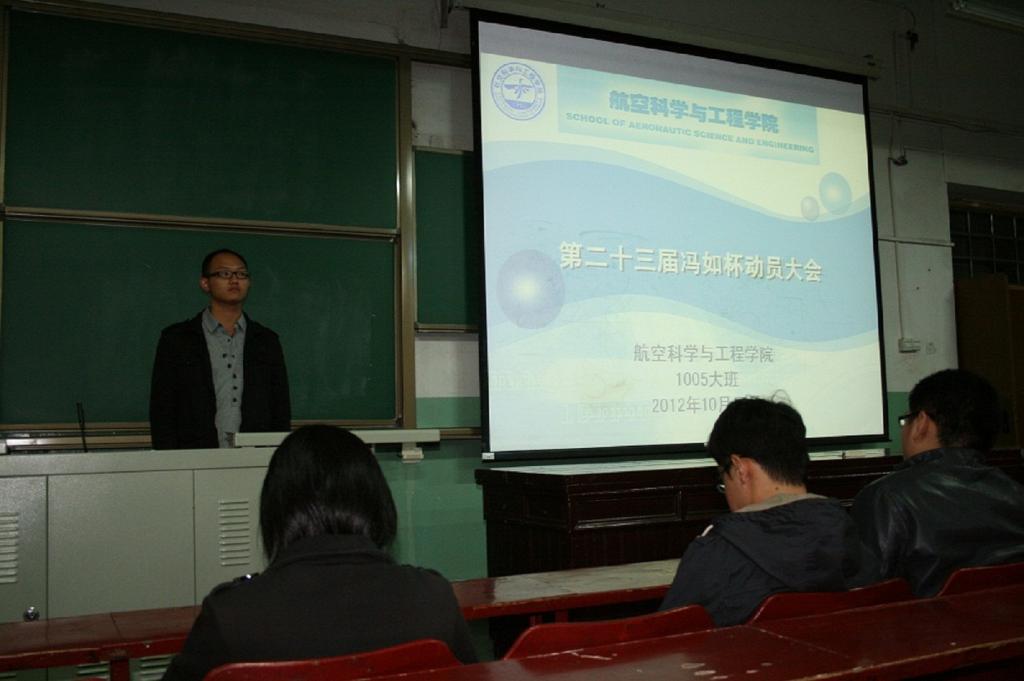 卓越辅导员发言 冯如杯动员大会现场 2012年10月14日晚6时30分,北航365英国上市公司1005大班第二十三届冯如杯动员大会在学院路校区主-127教室顺利举行。