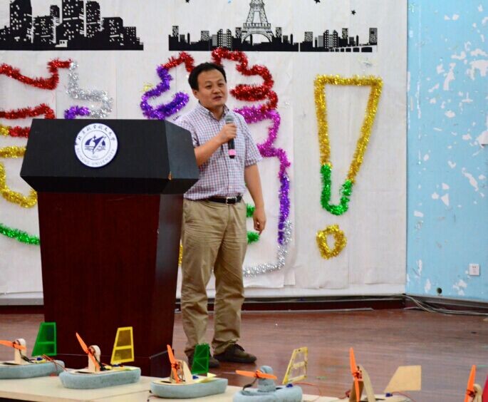 指导老师万志强总结本学期课程开展情况 比赛正在激烈的进行中 学生作品展示 丰富的比赛奖品 赛后合影 2014年6月15日,首届“气浮式贴地航行飞行器竞速比赛”决赛在沙河校区多功能厅隆重举行。