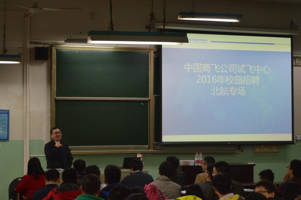 2015年10月26日下午两点,中国商飞公司试飞中心人事部门一行,来到北航,在三号楼317教室进行了宣讲招聘活动。