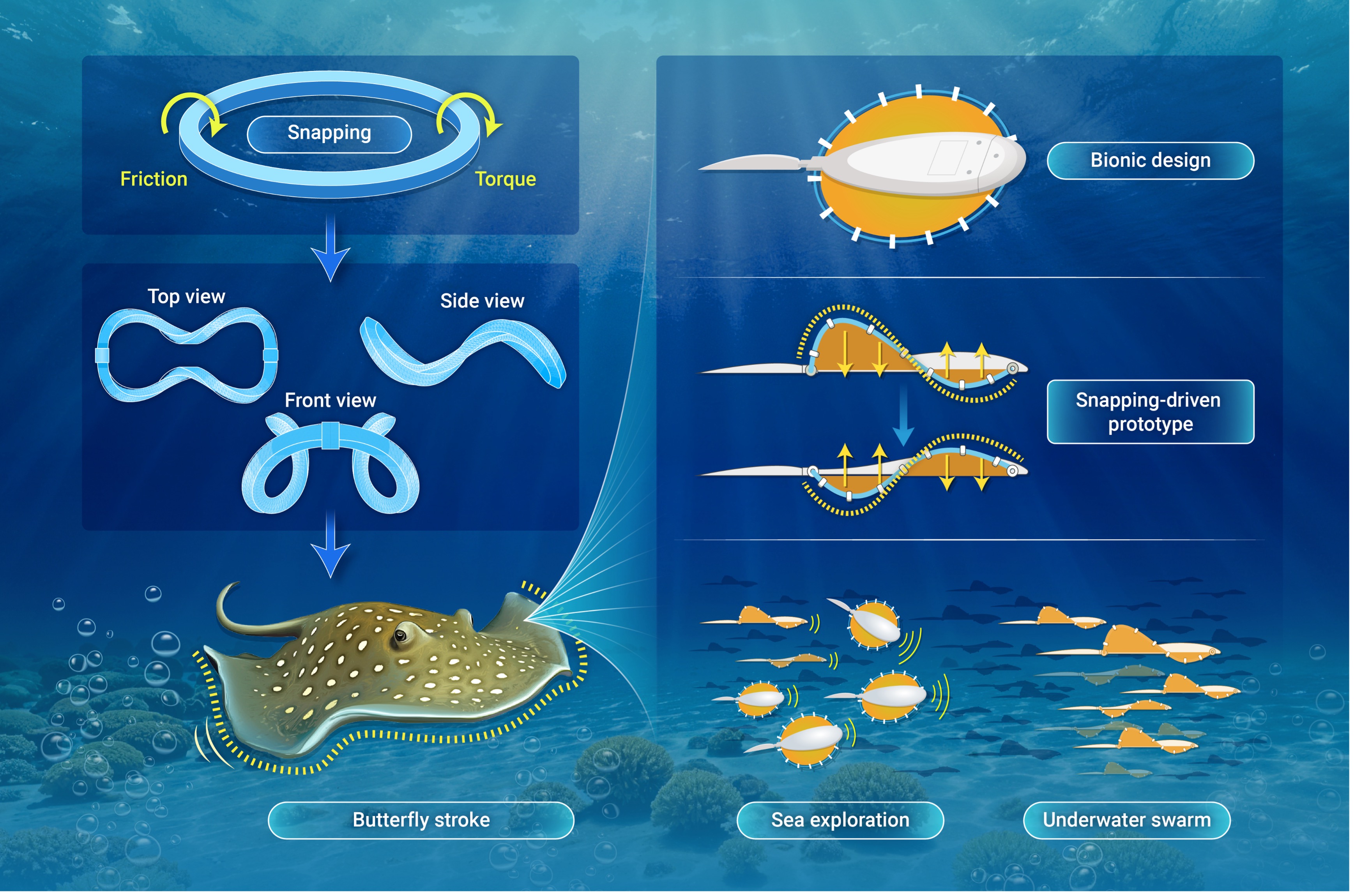 近日,我院赵子龙教授及其合作者在综合类顶级期刊《The Innovation》(中科院分区1区;影响因子:25.7;引用分:53.4)发表论文《Robotic ray driven by periodic ring snapping》。他们从蓝斑条尾魟优雅的泳姿中获得灵感,提出了新颖的水下驱动方式,研发出高效、稳定且隐蔽的仿生软体机器鱼。这项成果在海洋探测、水下机器人等领域有潜在的应用价值。 在游动时,蓝斑条尾魟的胸鳍发生低频周期性波动变形(图1)。与尾鳍推进...